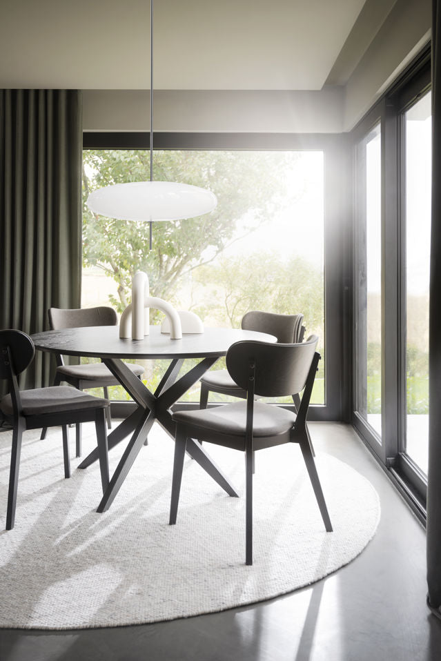 Calverton matbord Ø120 cm har med sin unika benställning i massiv ek och luftiga uttryck ett högt designvärde. Det svartlackade matbordet är helt rätt i tiden och passar fint med både trä- och tygklädda stolar som enkelt placeras runt bordet. Den fanerade borstade bordsskivan framhäver den naturliga träkänslan och passar perfekt i skandinaviska hem.