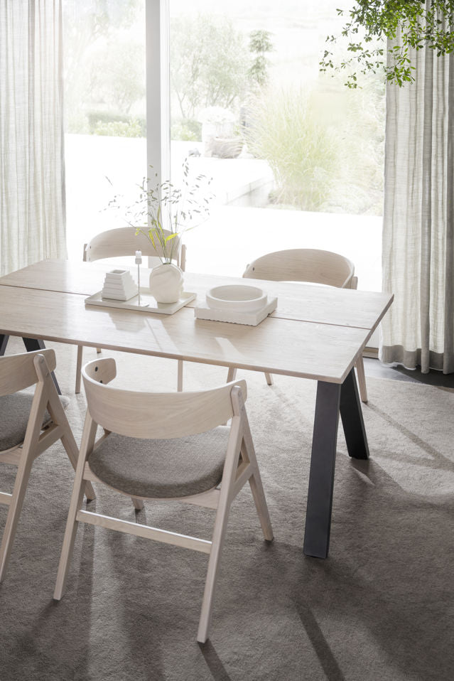 Carradale matbord 170 cm i vitpigmenterad oljad FSC-certifierad ek. Tvådelad massiv bordsskiva med borstad yta och V-formade ben i svart pulverlackad metall. De eleganta V-benen ger bordet ett luftigt uttryck. Bordsskivan kan kompletteras med 1 eller 2 tilläggsskivor à 50 cm vilket kan göra bordet upp till 270 cm långt. Matbordet ingår i den flexibla Carradale-serien där du kan utforma bordet som du vill ha det genom att välja mellan olika former och färger på bordsskivan samt vilken benställning du vill ha.