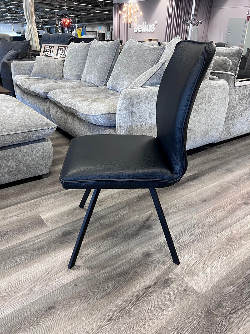 Saga är en klädd köksstol i äkta läder. Svart lackat metall underrede.