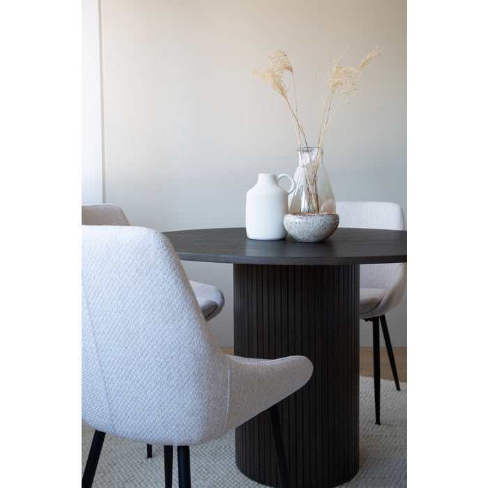 Padova är ett modernt runt matbord med en snygg ribbad pelare. Storleken 110 cm passar perfekt till 4st. snurrbara stolar.  Förhöj ditt kök med ett runt Padova matbord.
