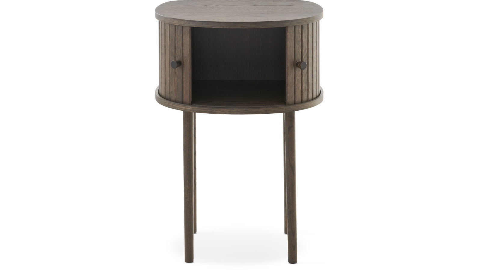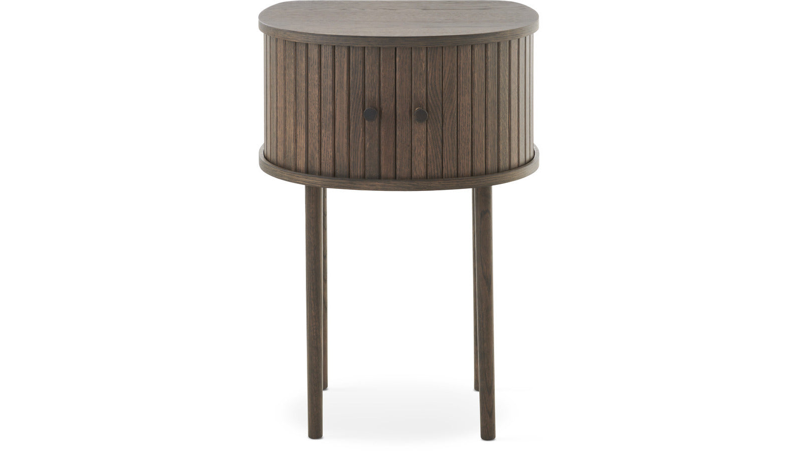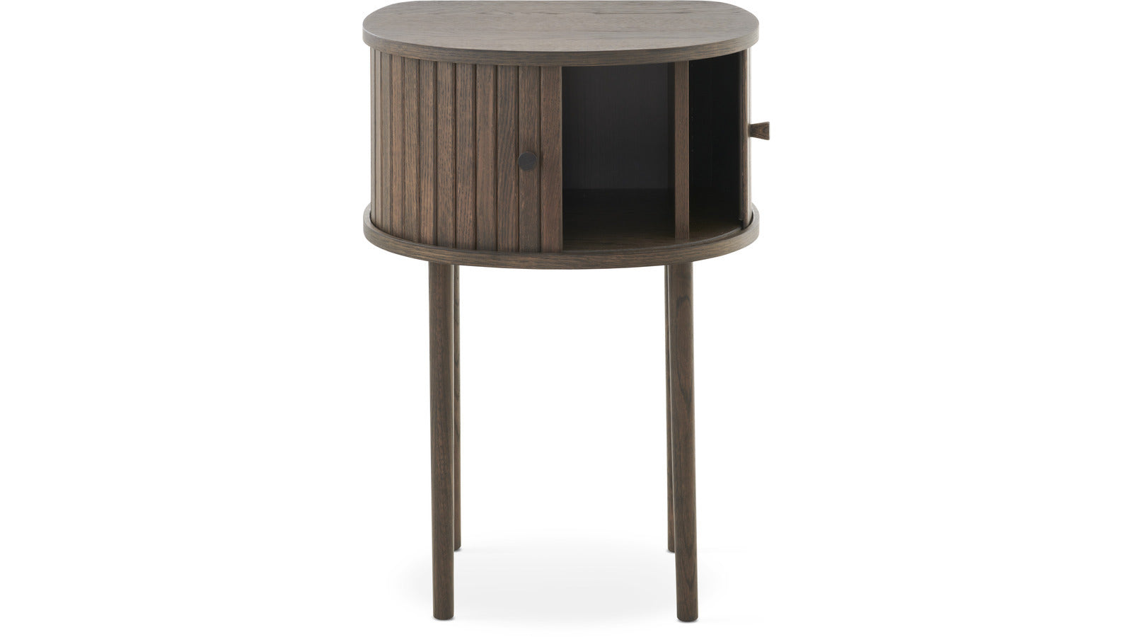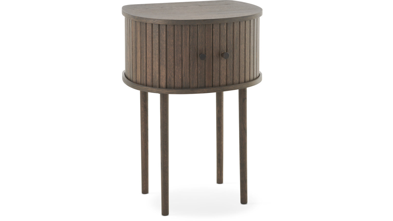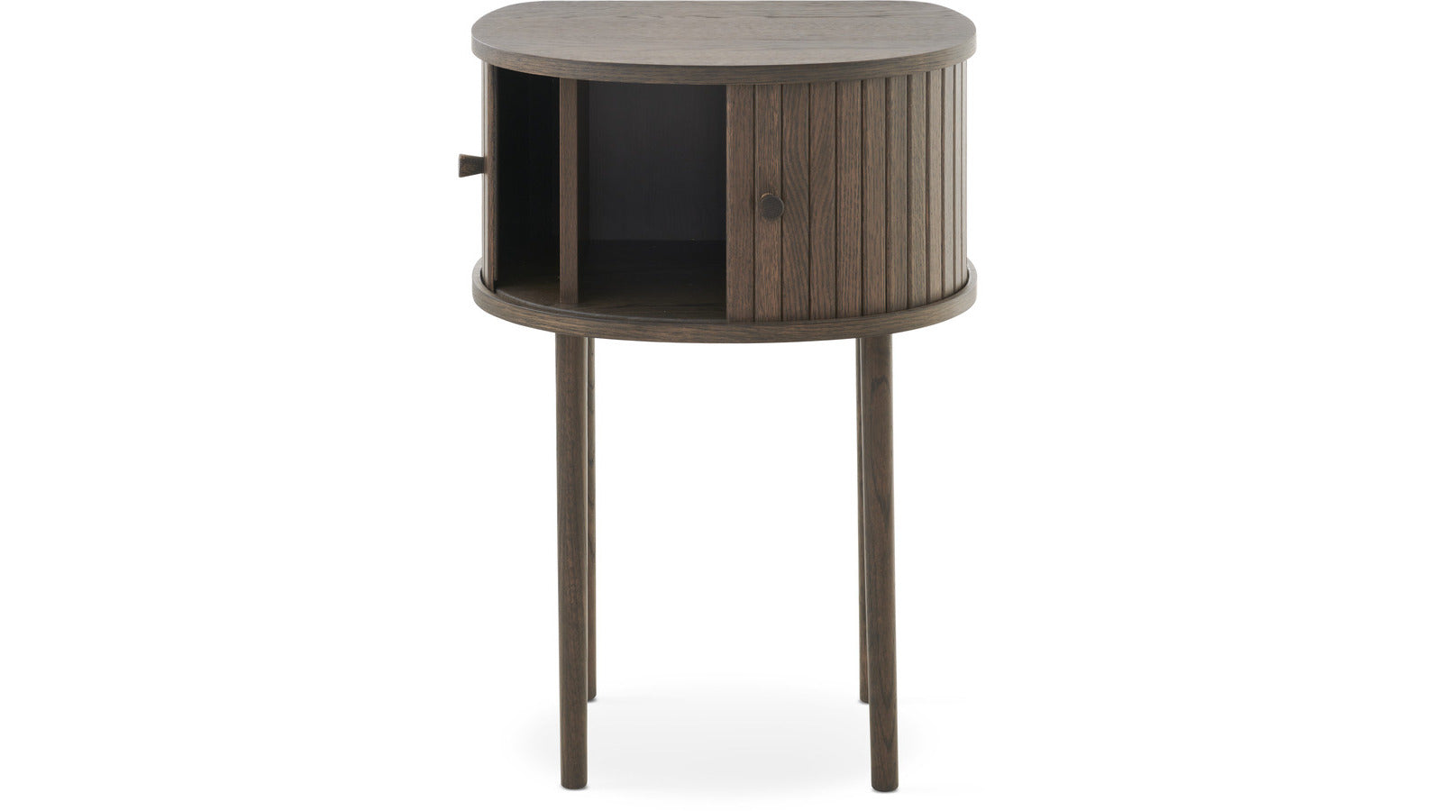 SLIDE är ett elegant och tidlöst sängbord i brunlackad ekfanér som kombinerar funktion med form på bästa sätt. Med sina mjuka linjer och solida uttryck passar det perfekt i det moderna sovrummet. Den varma, Belfort-bruna tonen ger en ombonad känsla och lyfter helheten i rummet.