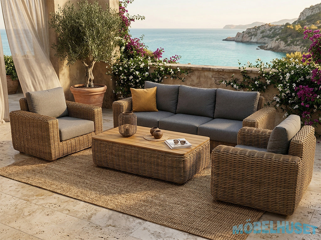 Den grova, handflätade konstrottingen i naturfärg ger ett gediget intryck och förstärker möblernas karaktär. Under finns en stabil stomme i aluminium som gör möblerna tåliga och anpassade för utomhusbruk. Dynorna i grå är klädda i slitstarkt olefintyg, vilket ger en bekväm sittupplevelse och bra motståndskraft mot väder och vind.