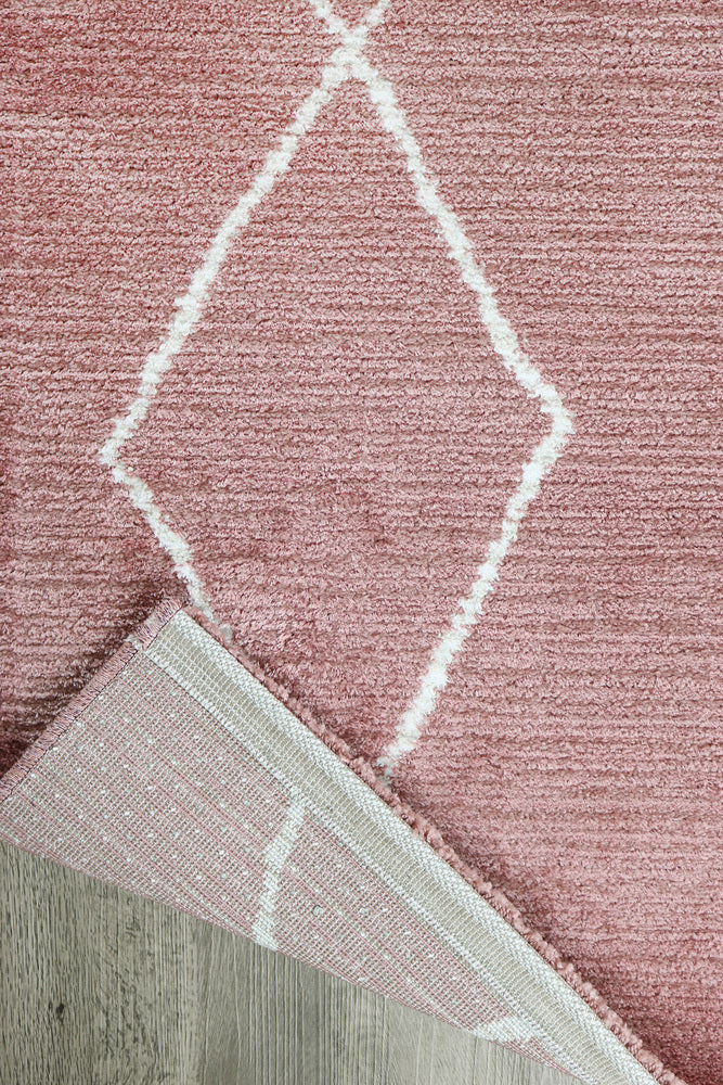 Modern maskinvävd wiltonmatta med ett berberinspirerat mönster i rosa och vitt. Berberinspirerade mattor har blivit moderna klassiker som fungerar fint i många inredningsstilar. Den ljust rosa färgen kontrasterar fint mot den vita mönsterbilden.